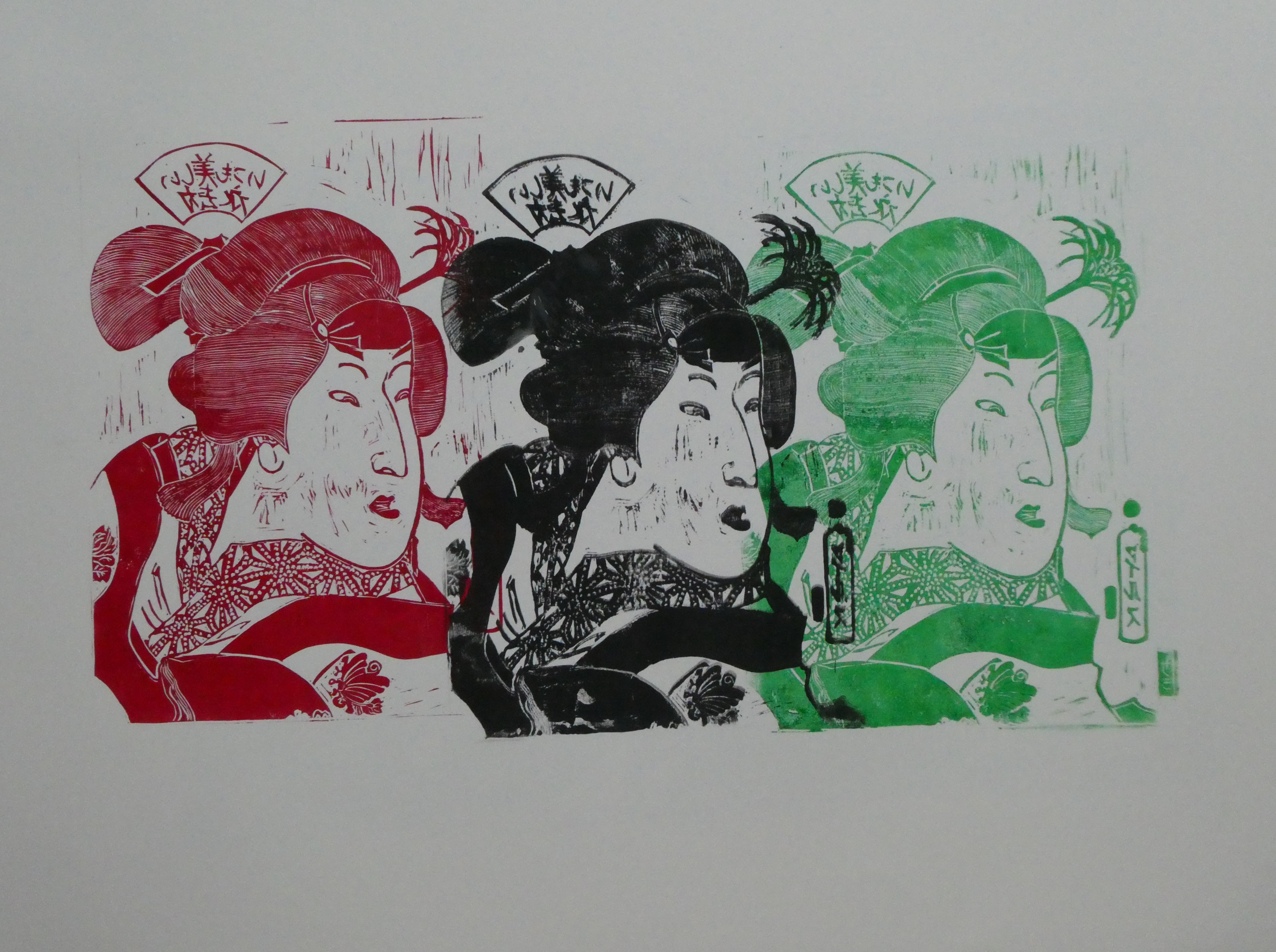 It was a feast for the eyes and as a result of that visit I decided I would create a couple of linocuts as an ‘Ode to Kunisada’. Here is the first of those.