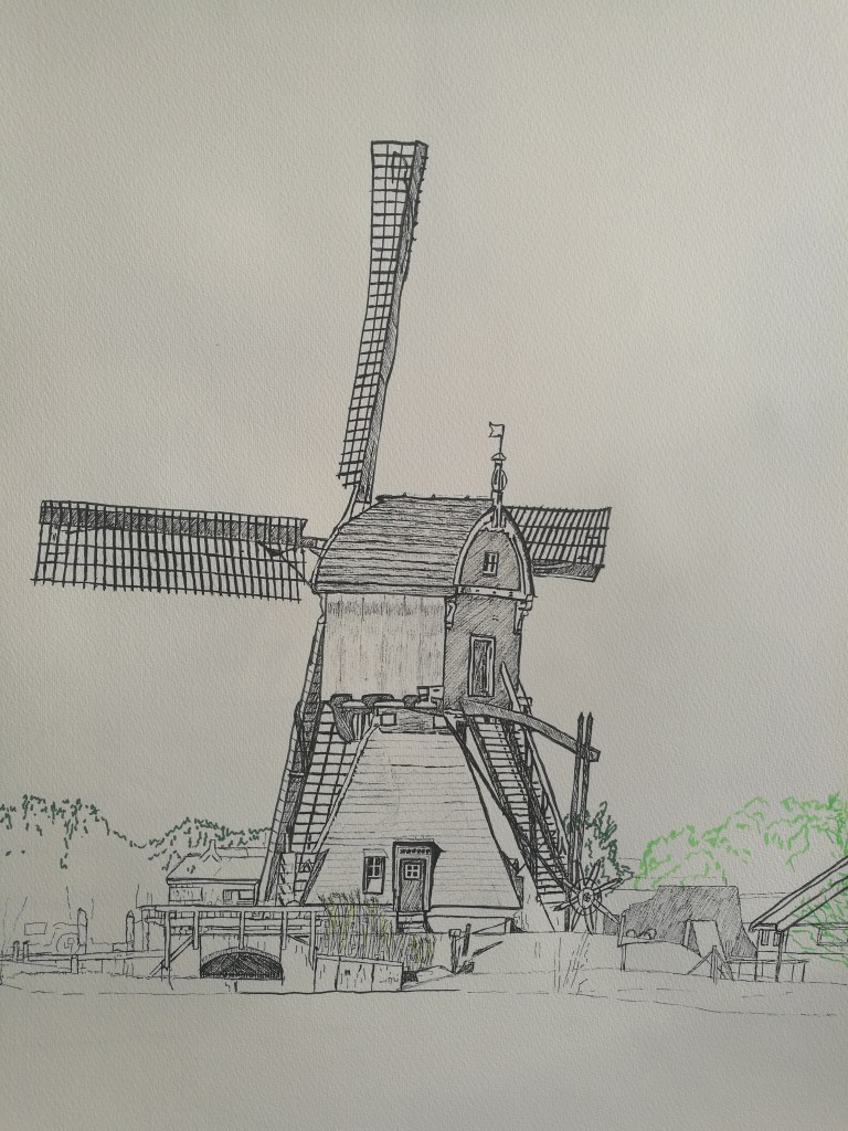 I’m currently working on a series of images of Amsterdam. My focus is once again on the architecture – I can draw nature in New Zealand but here I like to wallow in the richness and beauty of the architecture. I also choose to include the cars and daily life- these pieces are historically bound. This drawing is indian ink (black and crimson) applied by paint brush, with a tiny bit of gold paint. I use a brush because this produces a looseness which I find more appealing to the eye. Rulers and straight lines produce an entirely different effect. The image is 92 x 64cm and paper size is 100 x 71cm.