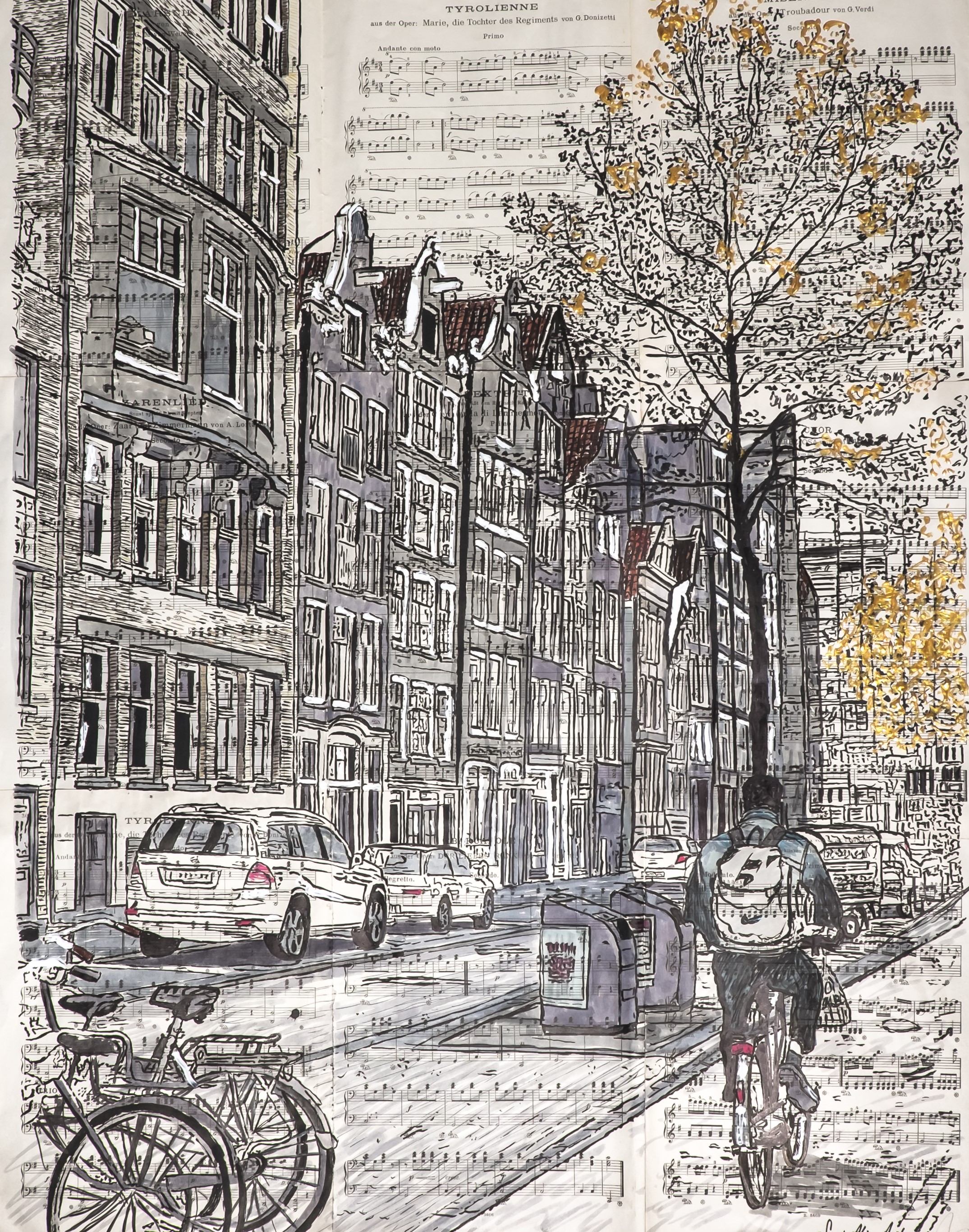 I have also used a hint of gold paint. My decision for manuscript paper arose out of my desire to create more depth and interest in the piece. Amsterdam is a busy place, why not create a busy image. However it is not until you step up close to the image that the notes of the staves of music become clear. The image is 87 x 66cm.