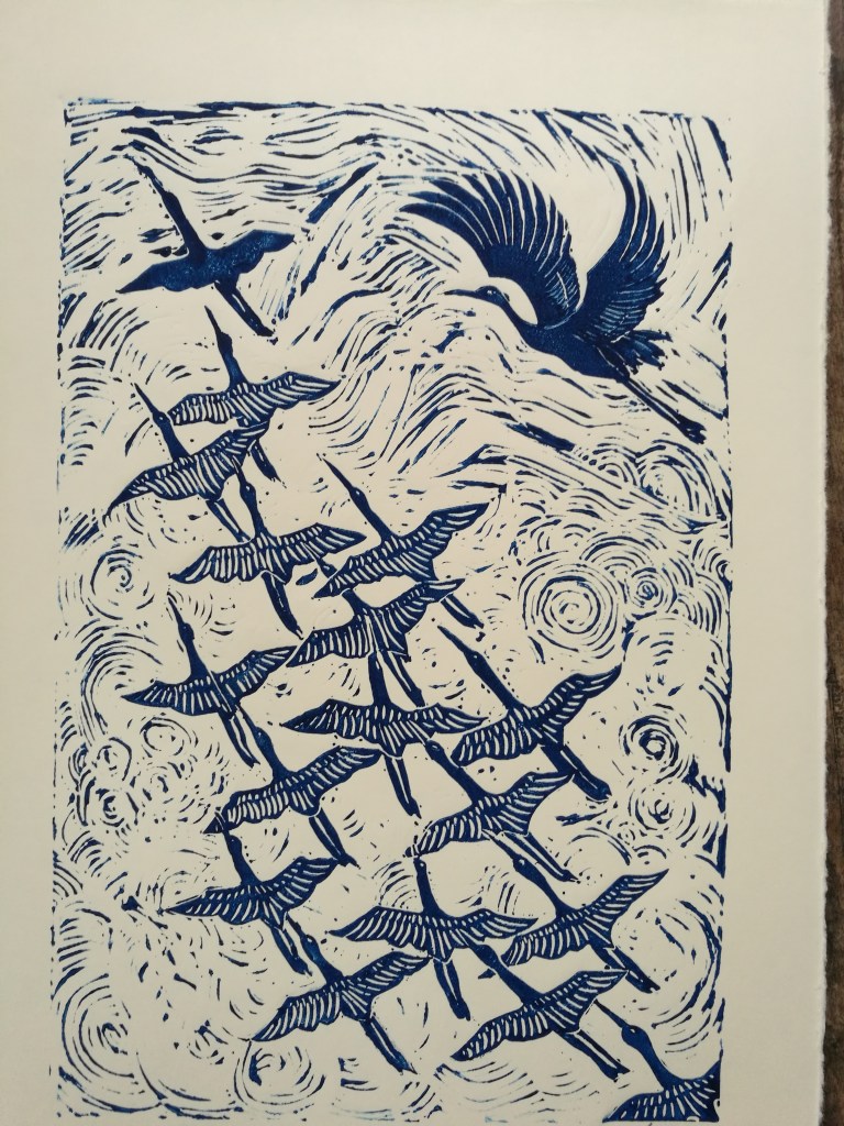 I think it is a real challenge to capture movement in motion. Not far from where I lived in the Netherlands there is a skateboard pipe (I think that’s what they’re called). After school and on the weekends the area is teaming with young lads, in the main, trying their hand at all manner of motion devices with wheels of varying sizes and on gradients of varying degrees of treacherousness. Its always exciting to watch that process of sheer lack of fear as they head down a steep slope balanced on four minuscule wheels. But in the main things go smoothly. Here’s one in a series of lino cuts on motion and movement.