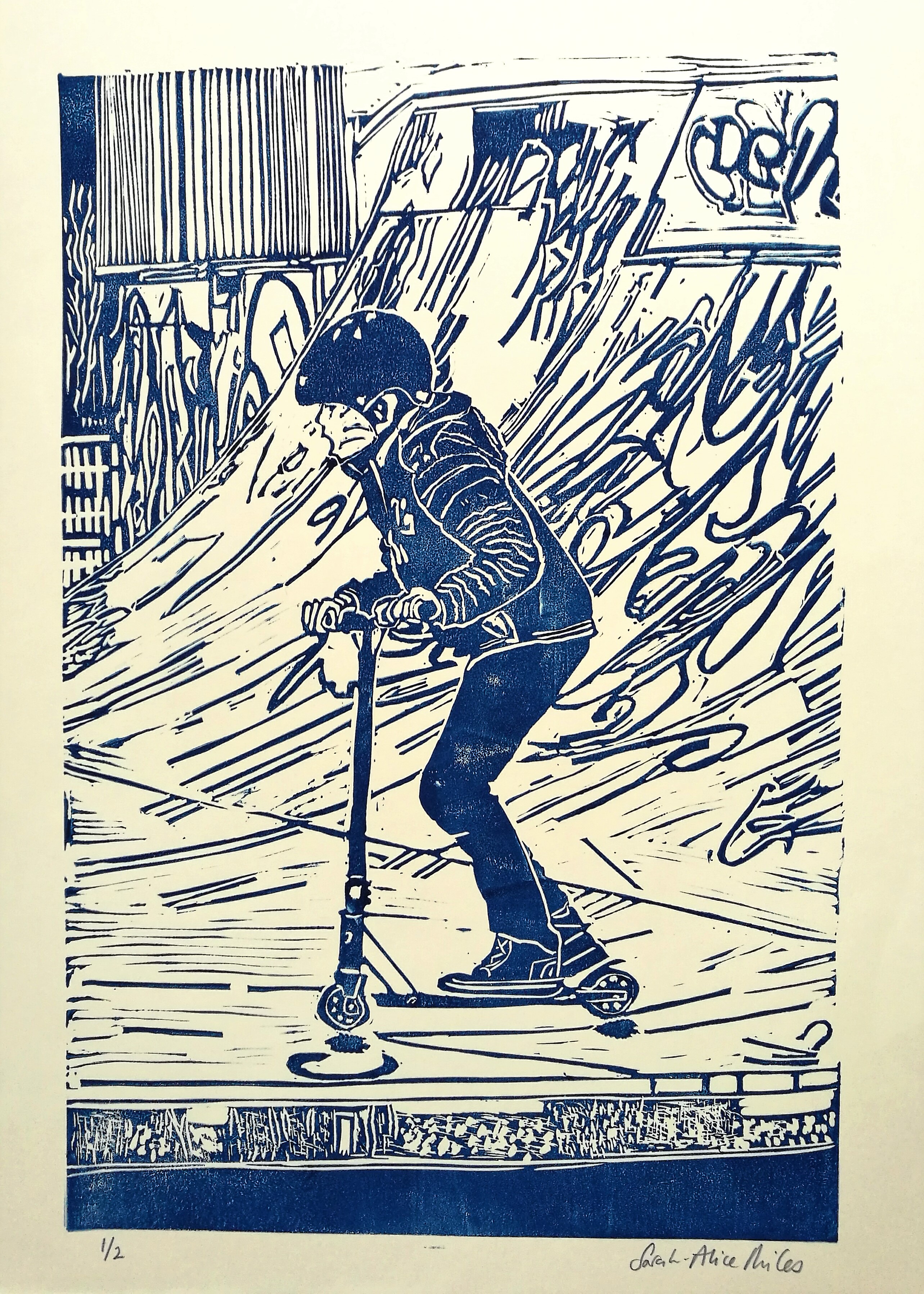 I think it is a real challenge to capture movement in motion. Not far from where I lived in the Netherlands there is a skateboard pipe (I think that’s what they’re called). After school and on the weekends the area is teaming with young lads, in the main, trying their hand at all manner of motion devices with wheels of varying sizes and on gradients of varying degrees of treacherousness. Its always exciting to watch that process of sheer lack of fear as they head down a steep slope balanced on four minuscule wheels. But in the main things go smoothly. Here’s one in a series of lino cuts on motion and movement.