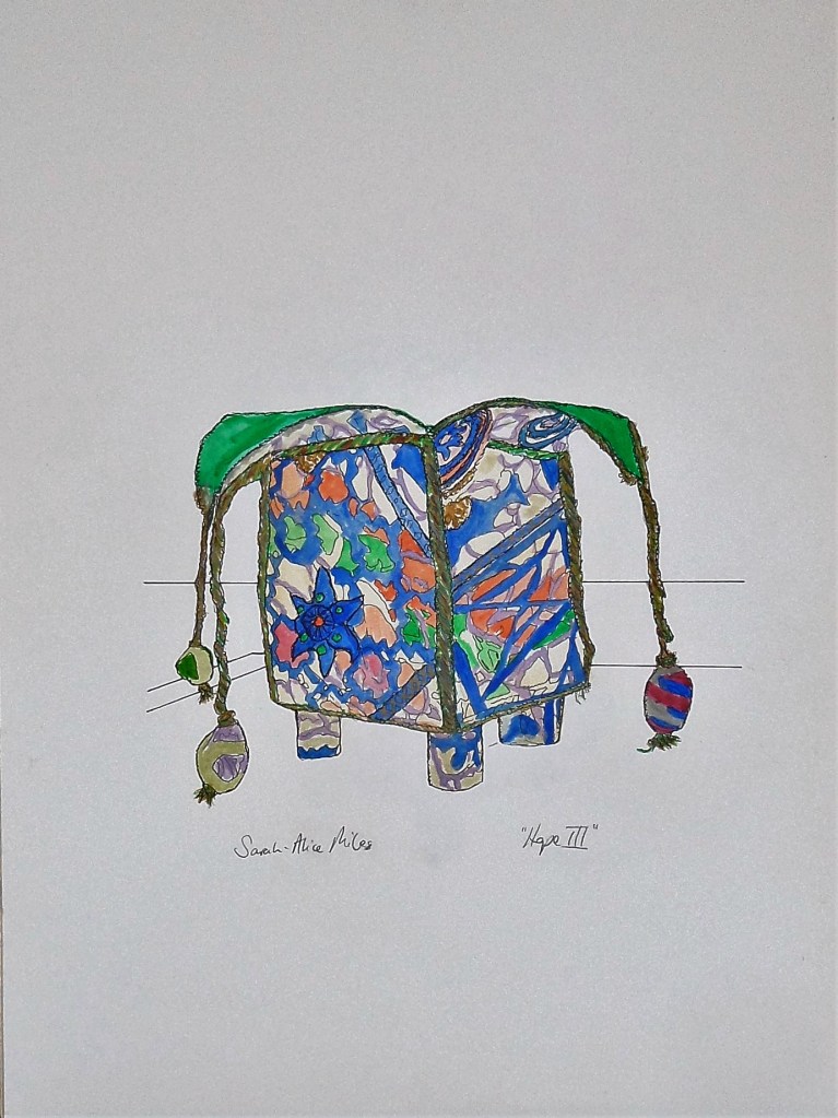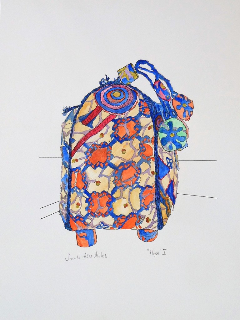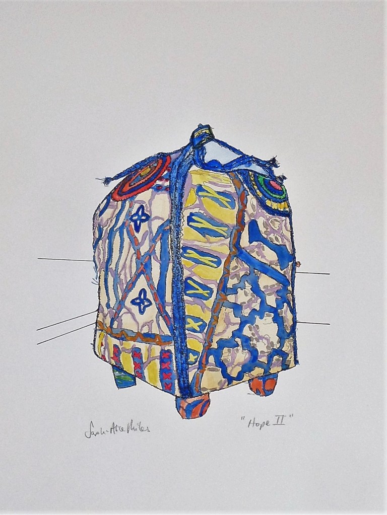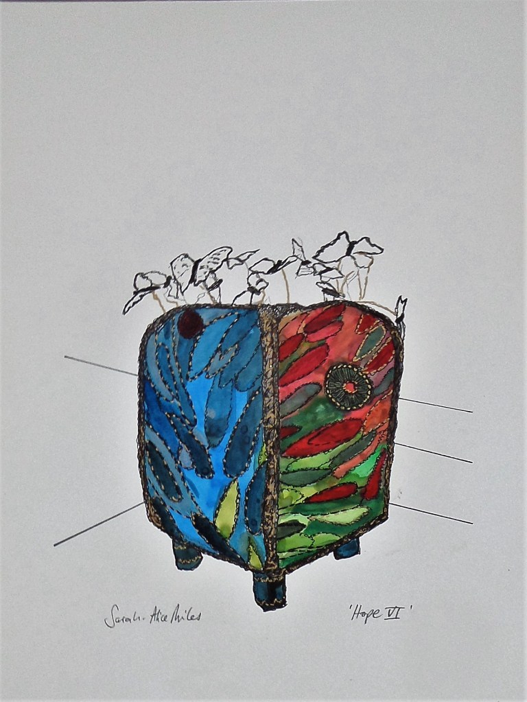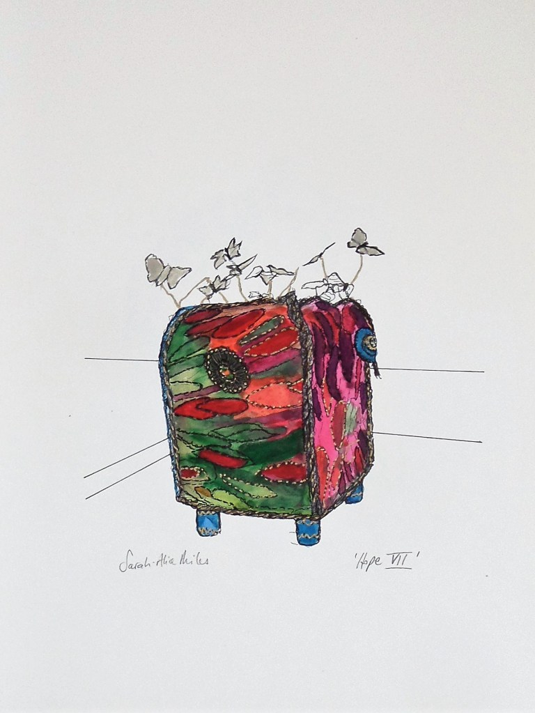 So what did I make? I made handmade fabric ‘hope boxes’ and the space around me slowly filled with my ‘hope’ boxes. The boxes represented for me, the ability to compartmentalize. A place of storage for my resilience. While I painted, stitched and sewed, my mind calmed, my thoughts focused on what I was doing and the disruptive world of dishonest insurance disappeared for a time. I later made water colour paintings of the work I had created.