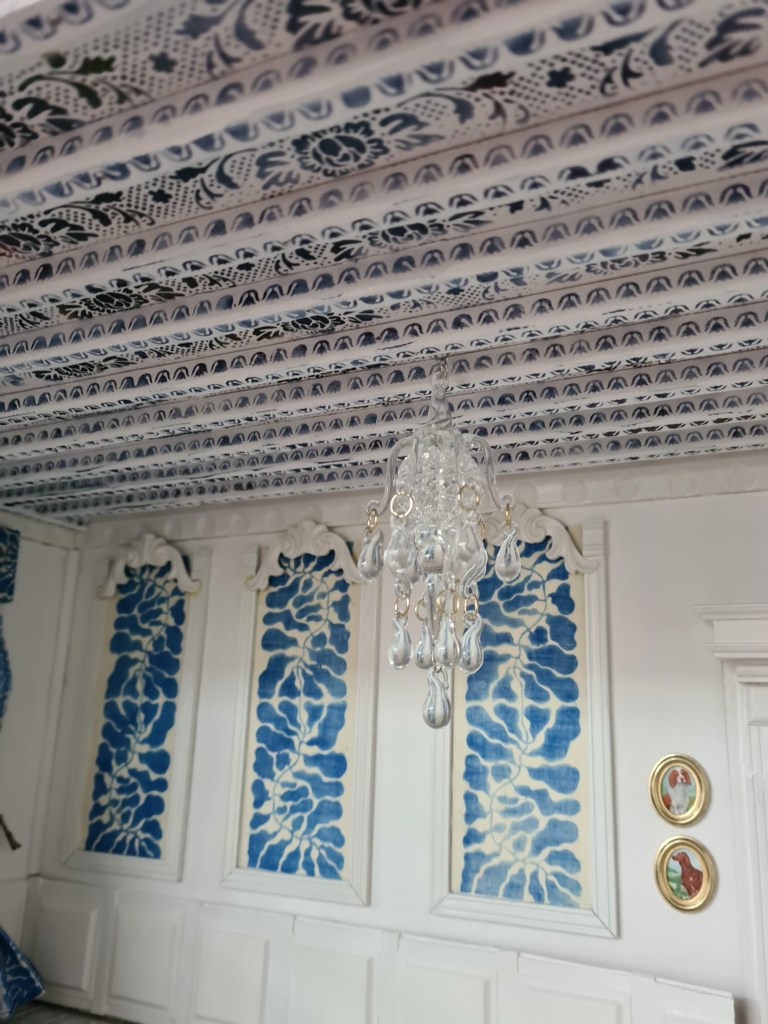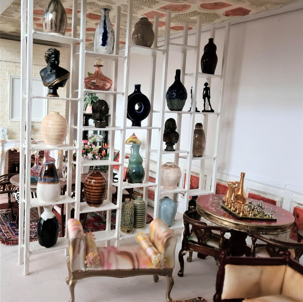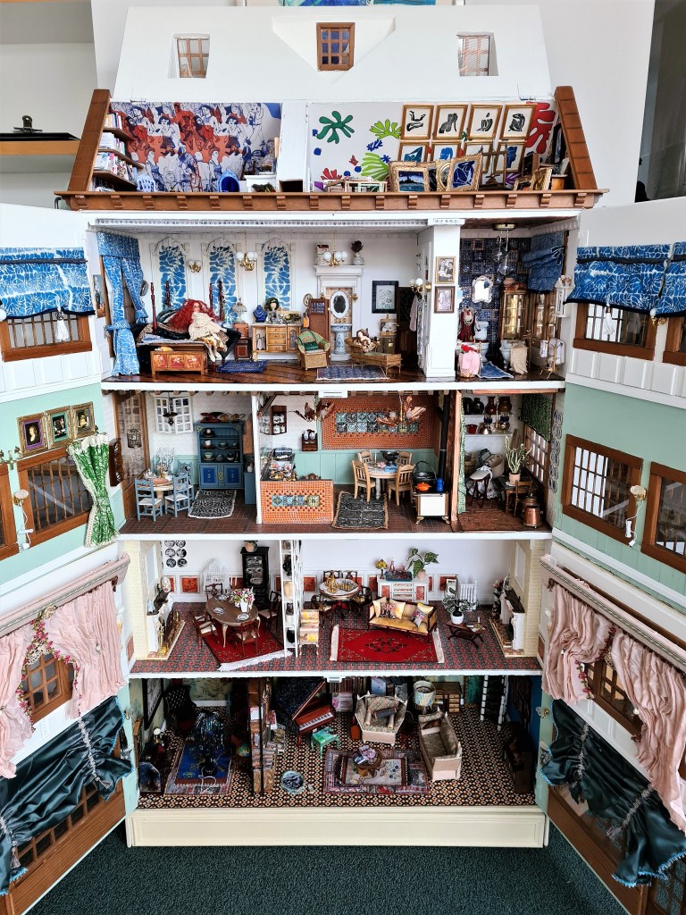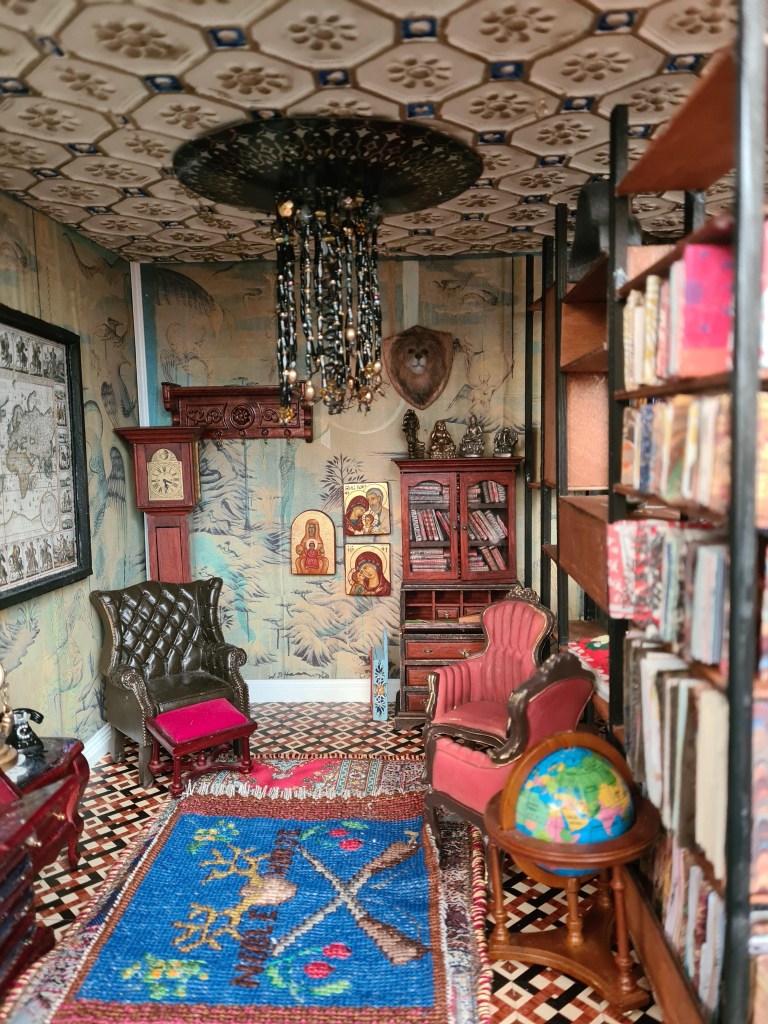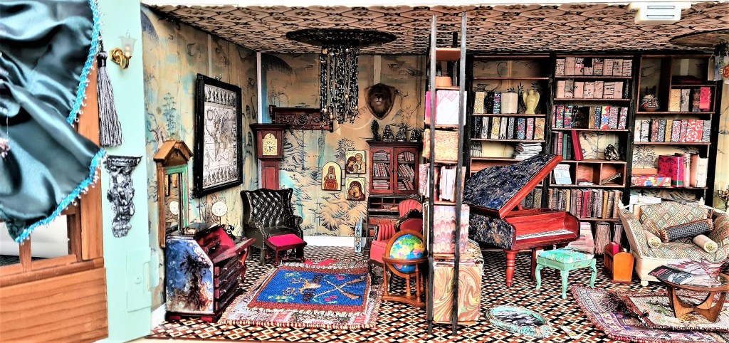 For those of us who are artists, a dolls’ house combines many aspects. It allows us to use our artistic skill-set to their fullest extent. It challenges us to create on a minute scale. To paint, print, etch, book-bind, micro-mosaic, clothe, decorate within the confines of a small space. My dolls’ house has become a vehicle for my artistic talents. I have my own permanent gallery on display when and how I choose. I open the doors of my dolls’ house. I see my own reflection looking back in all its order and perfection. It’s just as I would have it.