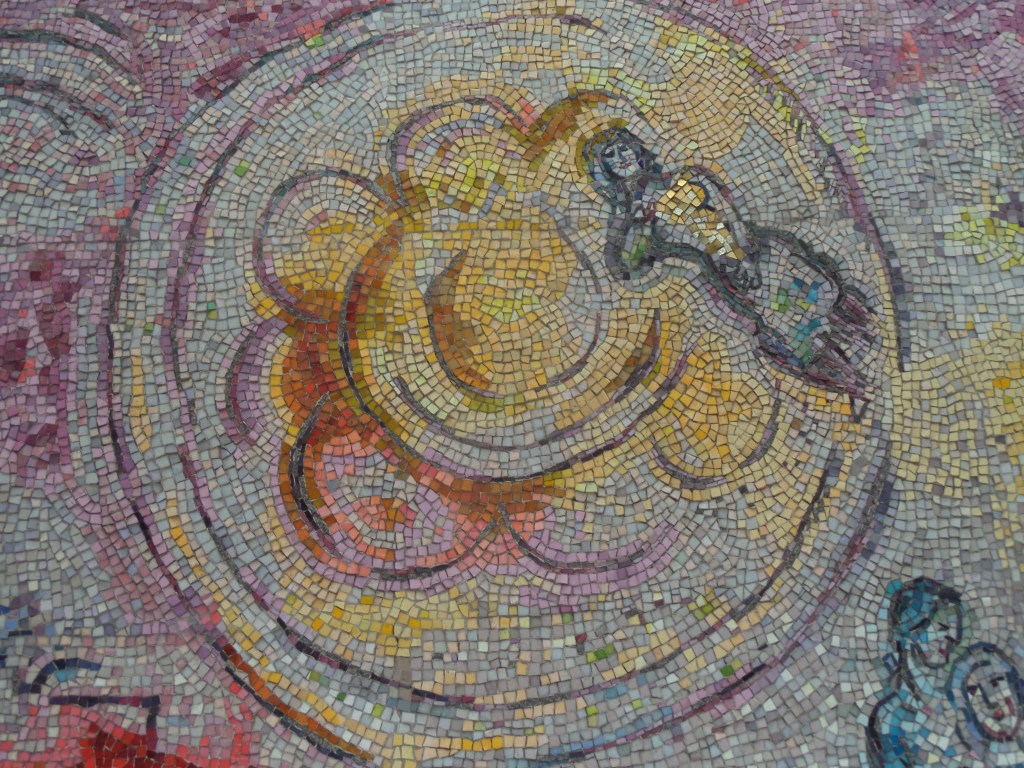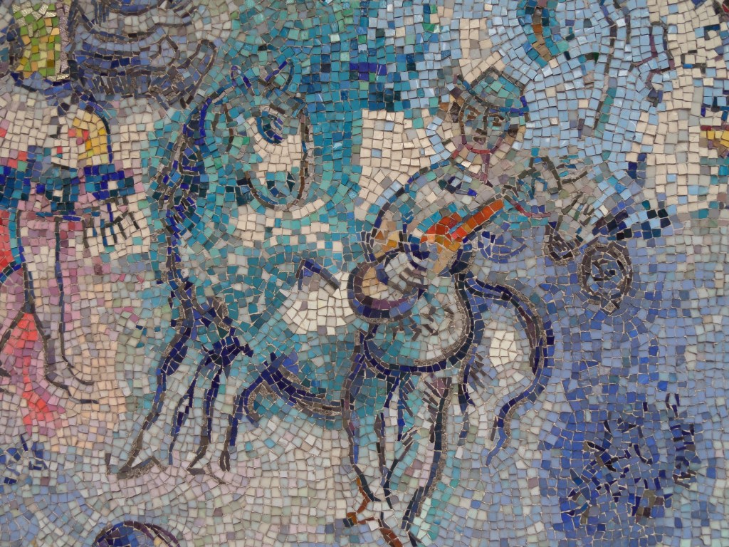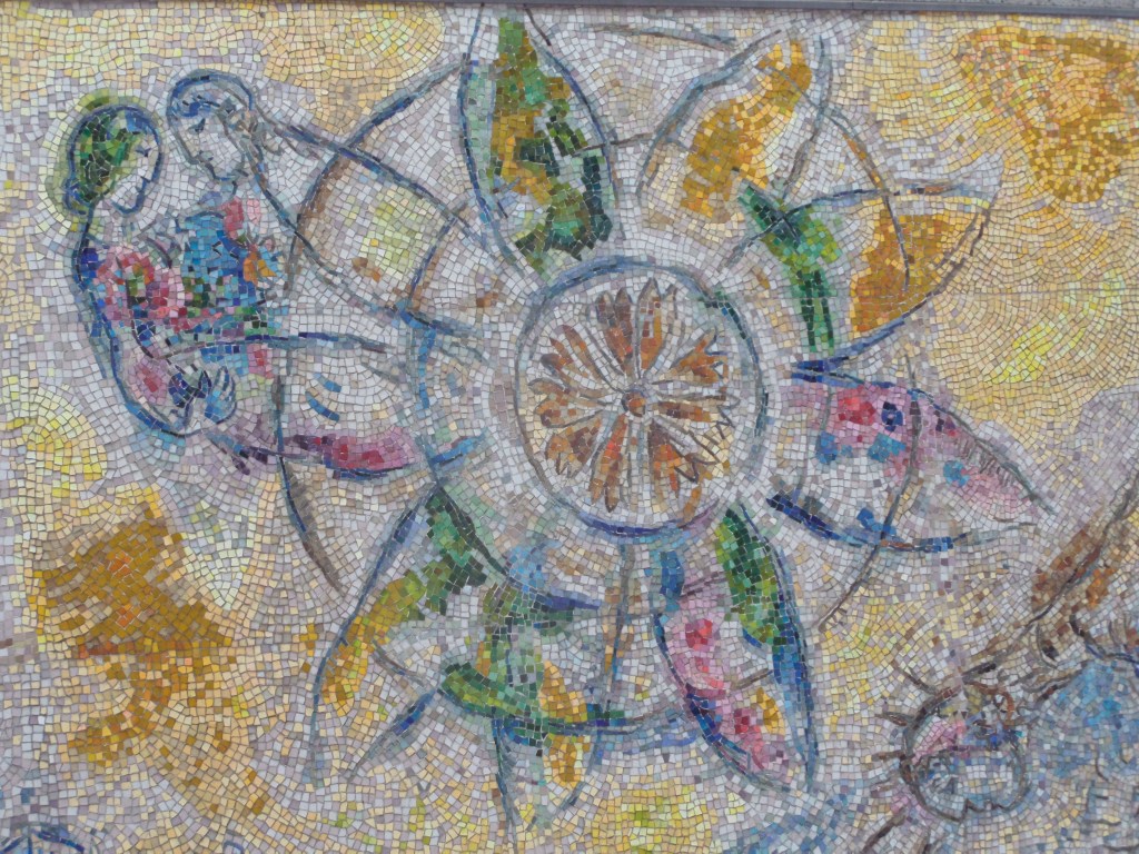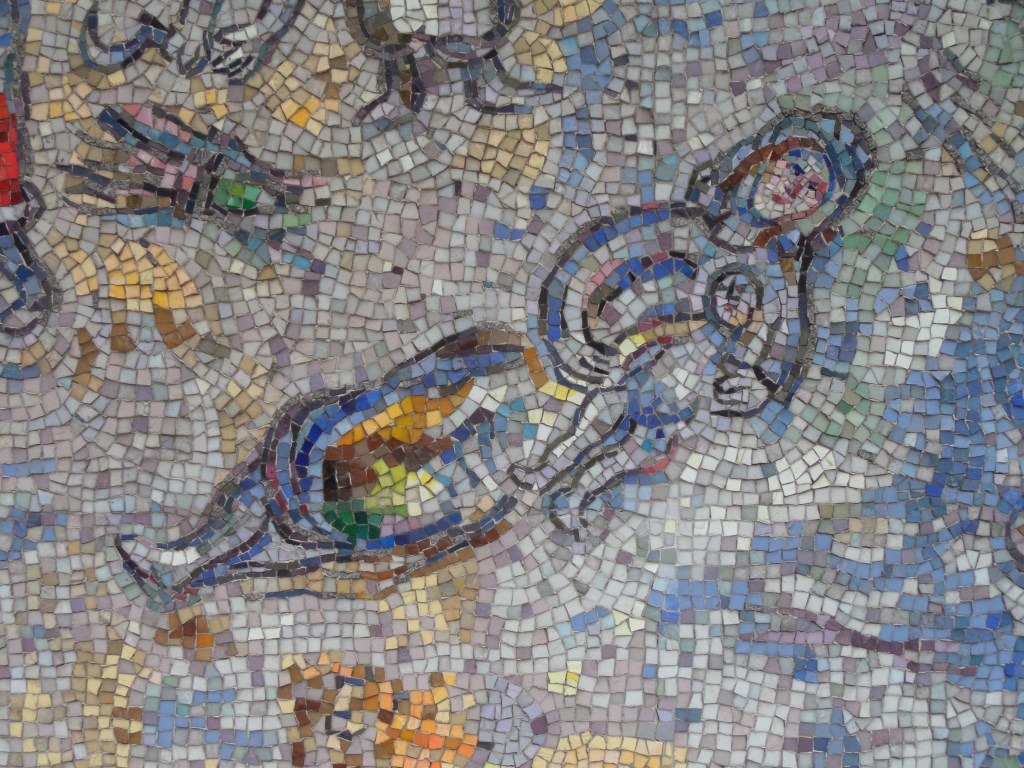 Materials were sourced from around the world, including marble from Belgium and Italy, Granite from Norway and Brittany, and stained glass from Venice and Paris. The panels were assembled in Chicago by Italian mosaicist Lino Melano, assisted by Michel Tharin, under Chagall’s supervision. The mosaic underwent significant restoration in 1994.