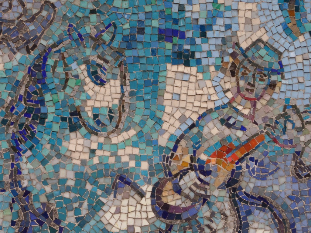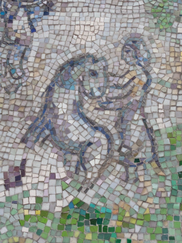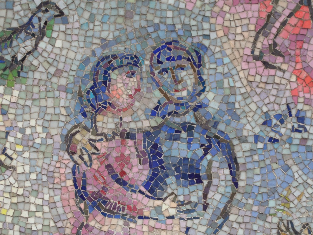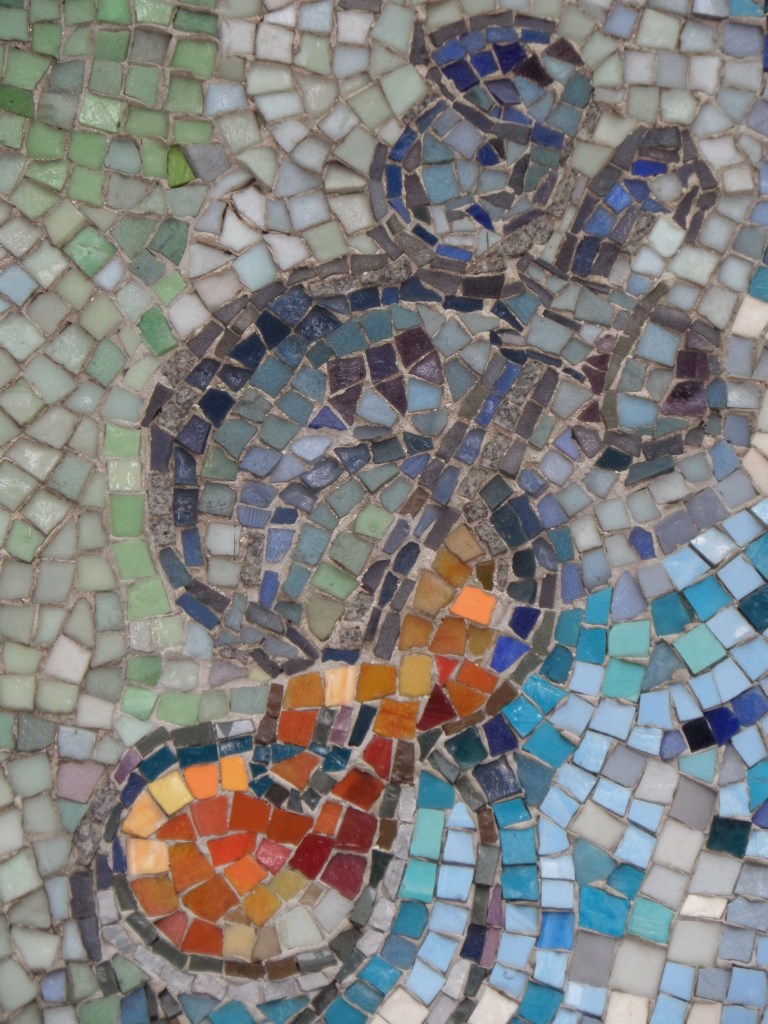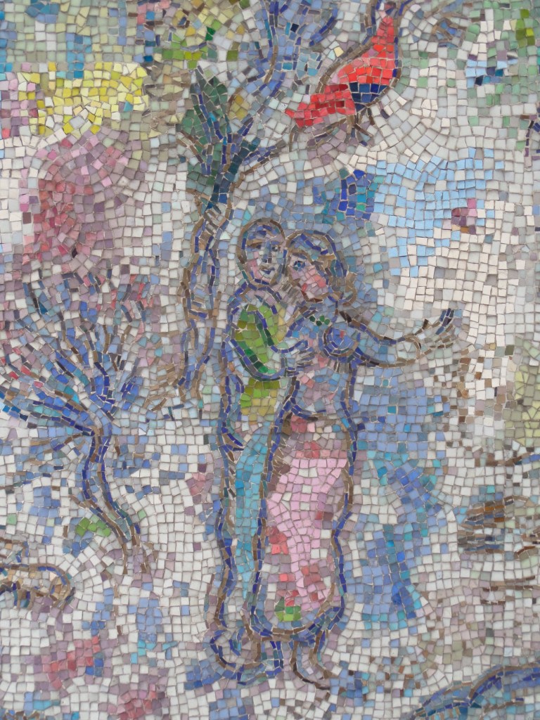 Materials were sourced from around the world, including marble from Belgium and Italy, Granite from Norway and Brittany, and stained glass from Venice and Paris. The panels were assembled in Chicago by Italian mosaicist Lino Melano, assisted by Michel Tharin, under Chagall’s supervision. The mosaic underwent significant restoration in 1994.