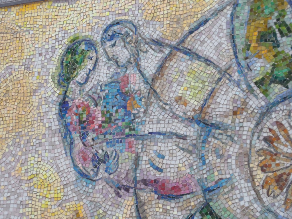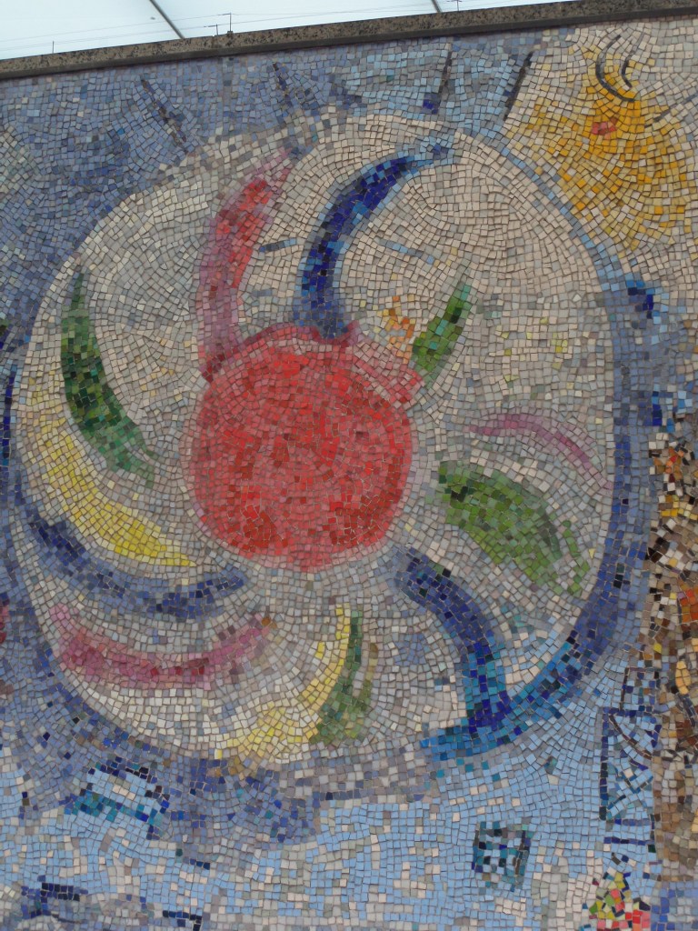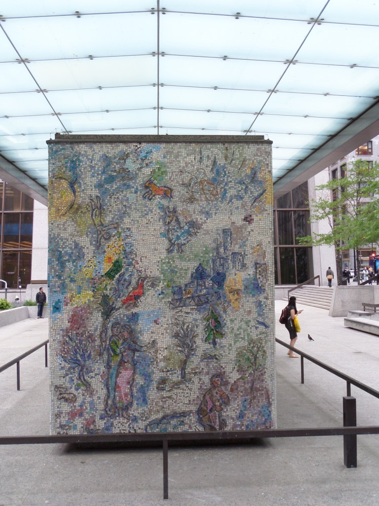 There’s the most amazing Chagall mosaic in the centre of Chicago. Four Seasons is a 1974 mosaic by Marc Chagall located inChase Tower Plaza in Chicago, Illinois. It is wrapped around four sides of a 70 feet (21 m) long, 14 feet (4.3 m) high, 10 feet (3.0 m) wide rectangular box. It depicts six vibrant scenes that celebrate Chicago across the four seasons.
