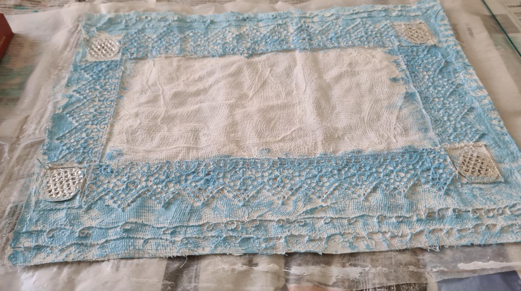 - Wet the interlining with the PVA solution and lay the strips of tissue on top and adhere them using more of the PVA solution. Also add rough strips of scrim and lace to create even more texture. Repeat the cutting, wetting and placing process and leave the piece to dry overnight.