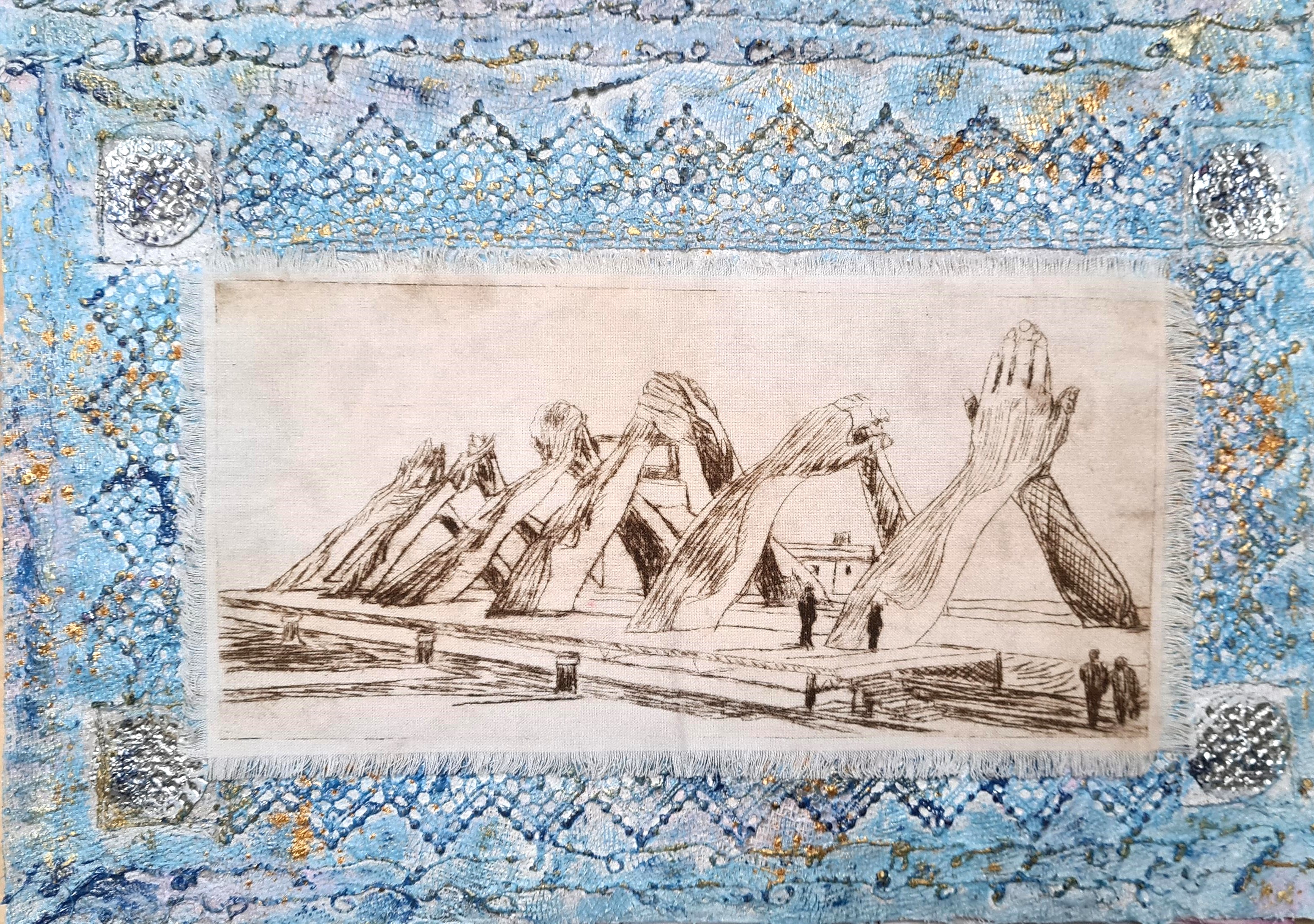 - Now begins the process of creating the insert for the frame. On this occasion I decided to create a dry point etch of the six pairs of 15-meter-high hands which form an arched bridge over a Venetian waterway in Venice, Italy. The hands embody the universal values of wisdom, hope, help, faith, friendship and love. In their union they stand for the human ability to overcome barriers and to act together. At almost 50 feet high and 65 feet wide, Building Bridges was a stunning addition to the city as part of the Venice Biennale in 2019.